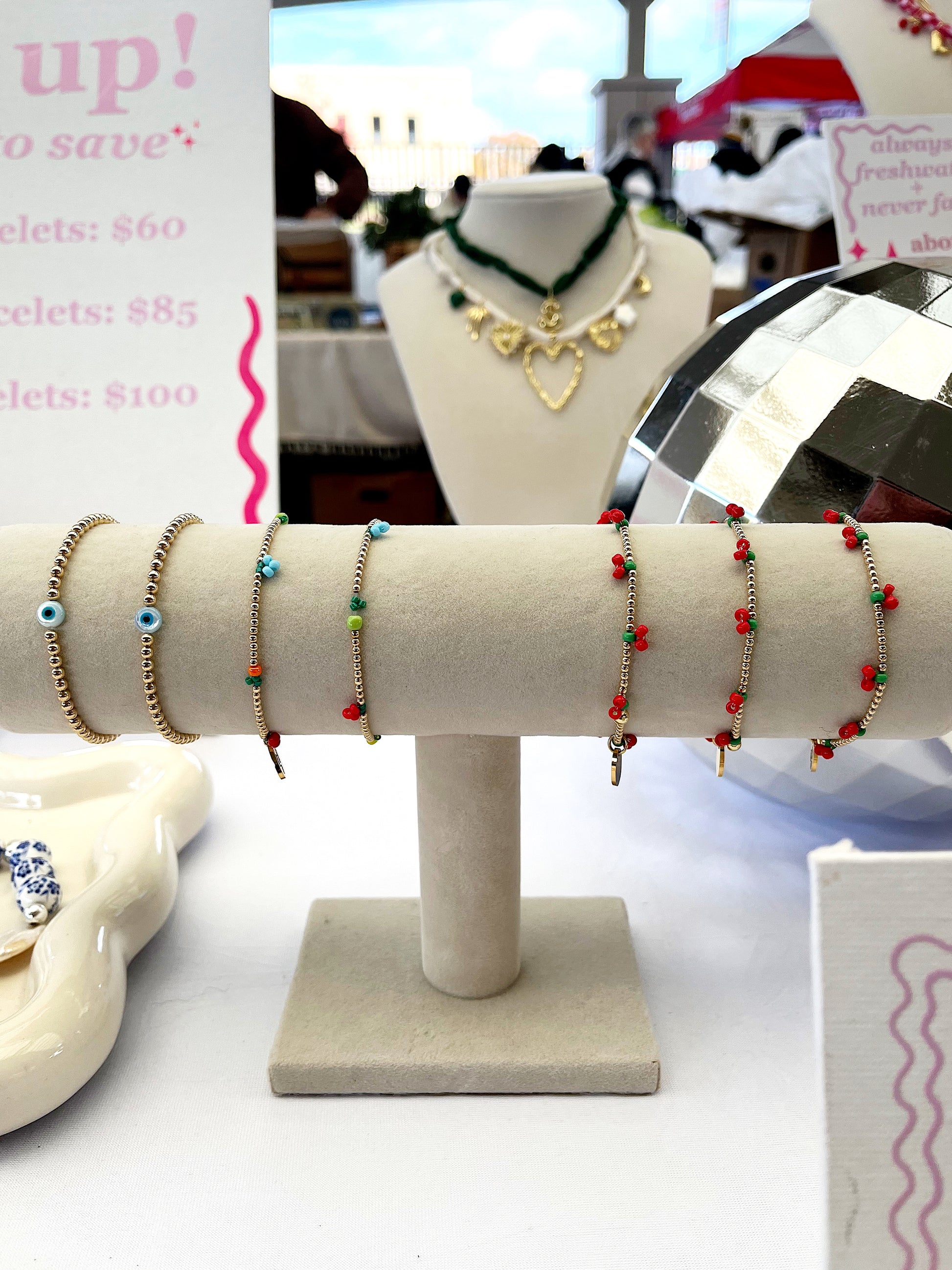 This juicy little number features glossy beaded cherries and gold beads, perfect for stacking or stealing the spotlight solo.