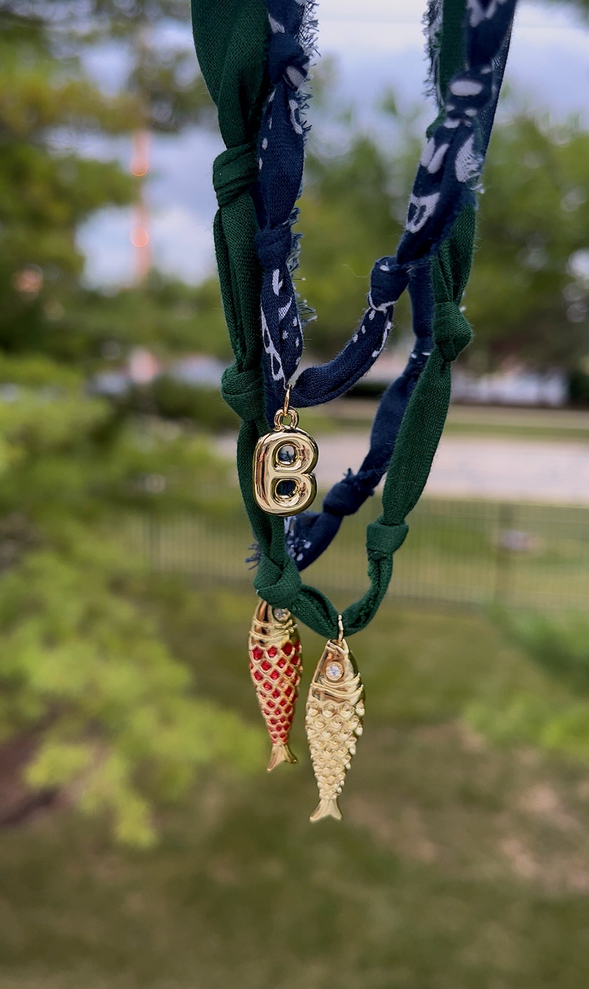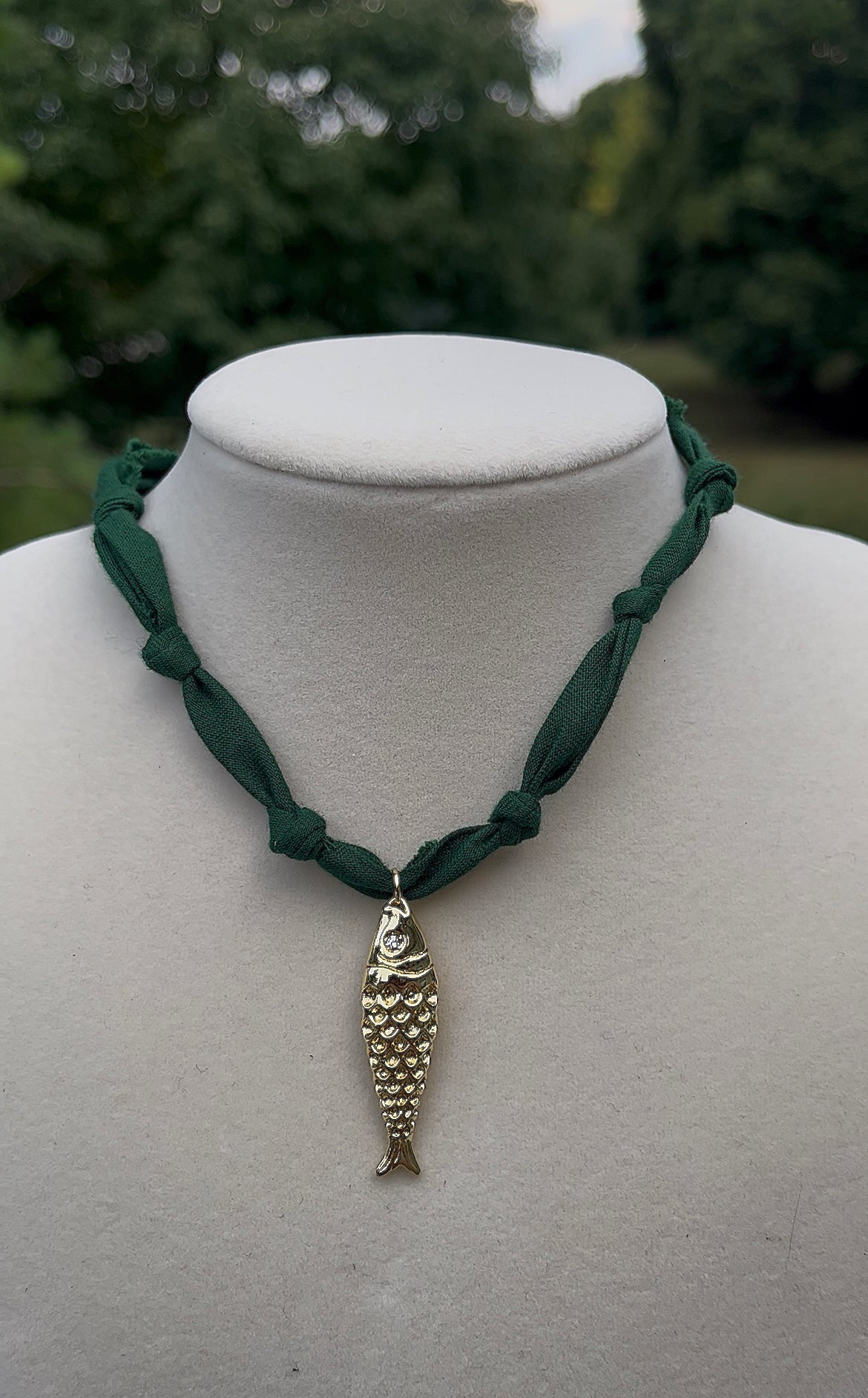 Gold filled fish charm with a rhinestone detail + forest green 100% cotton scarf